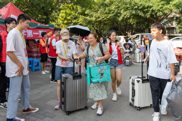校园内到处都有迎新志愿者和工作人员,为新生指引路线、搬运行李,热情地帮助刚踏入校园的萌新熟悉校园生活,校园小白龙免费接送,学校还设立了家属休息区、饮水点、医疗废物点等服务点,为新生和家长提供全方位的服务。管理学院新生王亚薇说:“今天到了学校,学长学姐们特别热情地帮我搬运行李,让我感觉就像回家了一样。”马克思主义学院2022级学生罗国美作为志愿者参与迎新工作,她说:“做了一天志愿活动,很辛苦但是值得。去年,我作为新生来到学校,就有很多志愿者学长学姐来帮助我,今年又由我来接新生,就感觉像是完成了一个闭环,而这样暖心的举动也会继续传承下去。新生们充满了朝气与活力,我在解答他们疑惑时可以感受到他们对大学欣喜又迷茫的复杂情绪,希望他们可以珍惜每一天,成为更加优秀的自己。”