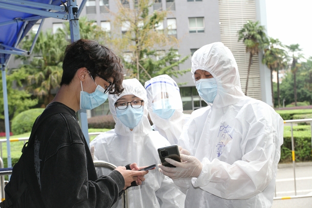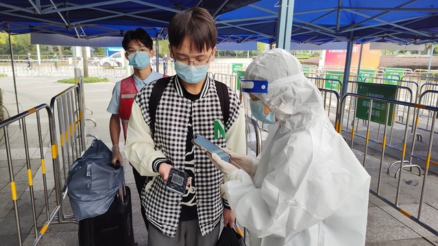 除了各学院的学生,还有一群“大白”志愿者。他们是一支由辅导员、专业课老师、行政人员等组成的党员教师队伍,负责检查学生的入校码,把好学生入校的第一关。管理学院2019级辅导员李思琪说:“期待了很久和大家线下见面,虽然和同学们在一个特别的时期以这种很特别的方式相见。作为进校‘第一关’ ,希望能让同学们感受到学校和老师们对这次返(到)校工作的重视与关心,希望疫情早日消退,祝愿新同学们能尽快适应大学生活。”