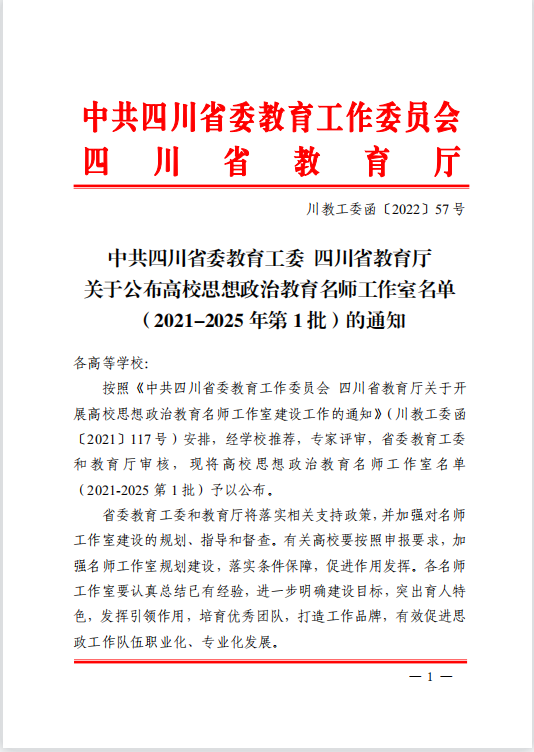 近日,中共四川省委教育工委、四川省教育厅公布了高校思想政治教育名师工作室名单(2021-2025年第1批)我校辅导员李萌申报的辅导员工作室成功入选